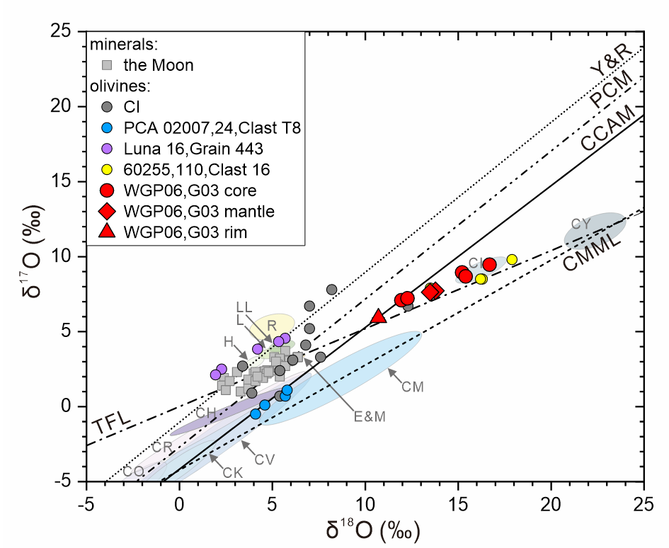 图3 研究样品的橄榄石三氧同位素组成。图中阴影区域为不同陨石样品的氧同位素组成。研究样品如红色点所示,相较于月球岩浆矿物显著富集重氧同位素,表现出和CI型或CY型球粒陨石类似的特点