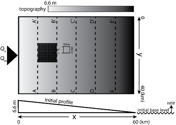 图1 初始模拟盆地剖面与空间格局。下文所示剖面均沿BB’线提取