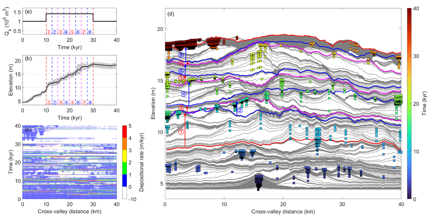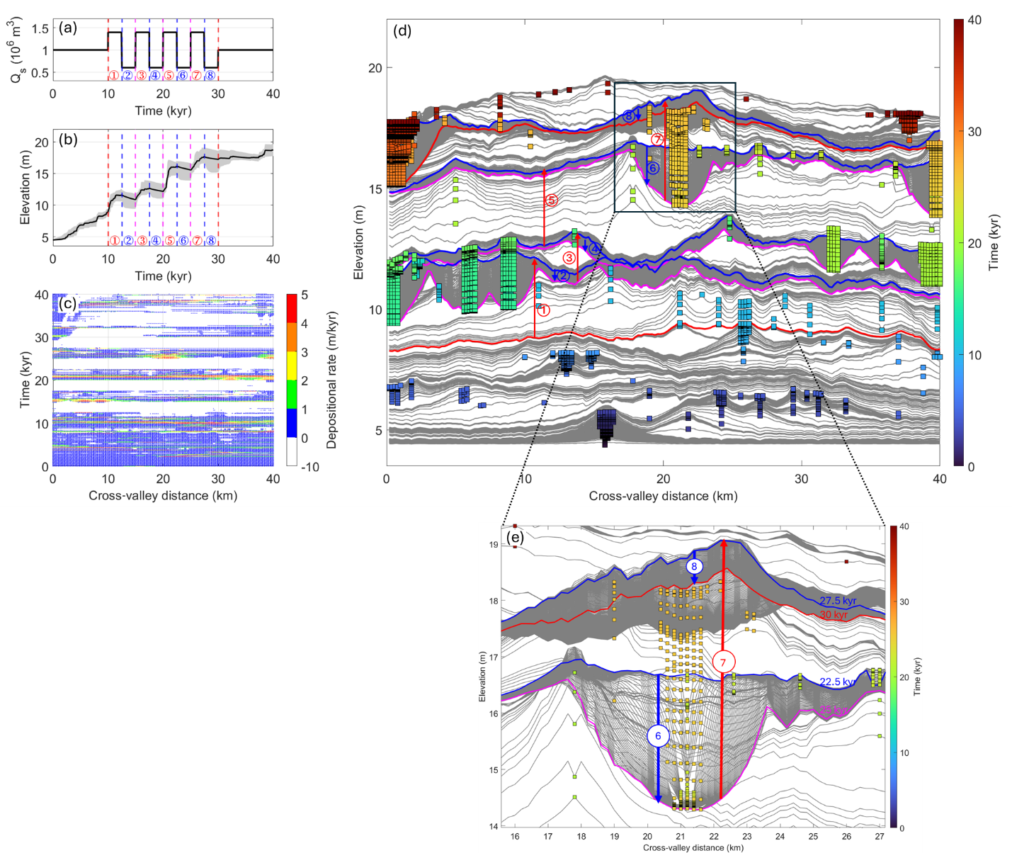 图2 基准情景下的地层剖面。(a)沉积物供给量随时间的变化。(b)剖面地形变化:灰色区域表示地形起伏范围,实线显示平均高程。(c)沉积速率时空变化的年代-地层图(类似Wheeler diagram),白点代表侵蚀,彩色点代表加积。(d)时间间隔为50年的地层剖面。时间线密集区域表示沉积作用微弱或无沉积,切割关系指示侵蚀。彩色方块标记河道位置(非实际尺寸)。带圈数字旁的向上和向下箭头分别表示加积与侵蚀