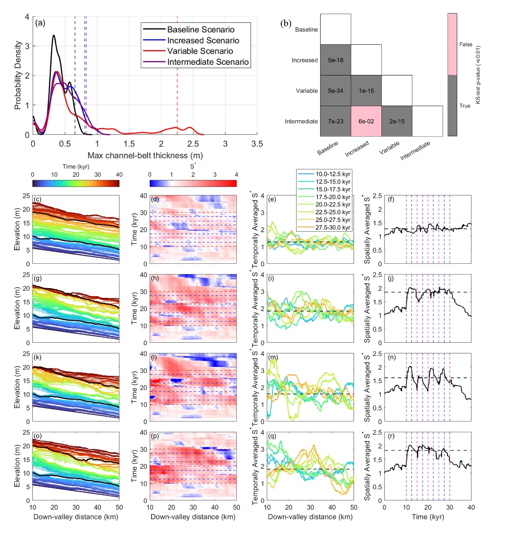 为解决这一争议,中国科学院地质与地球物理研究所王友伟特聘副研究员与荷兰代尔夫特理工大学Hemmo A. Abels副教授合作,采用地层正演模拟方法,系统研究了阶跃增加与变率增强两种沉积物通量扰动模式对河流沉积系统地层结构、河道砂体厚度及河流纵剖面坡度的影响。