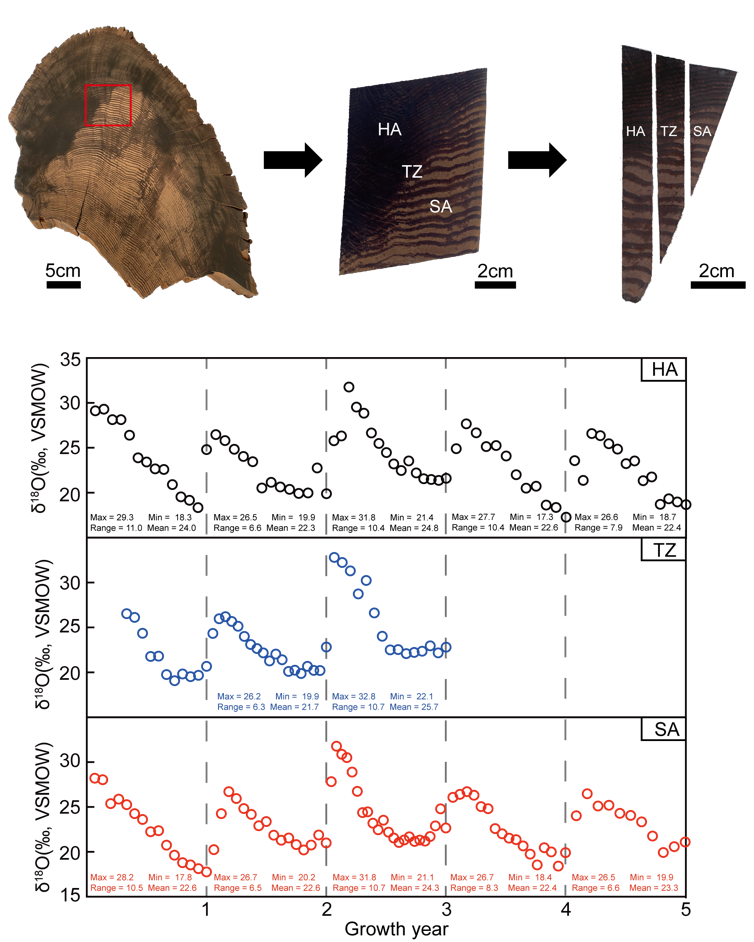 树木能够在年轮中记录下每年生长过程中的气候特征,是大自然的天然记录仪。树轮纤维素中的氧同位素(δ18O)能够高分辨率地记录降水、蒸发和大气环流等气候过程,因此不仅能用于分析深时气候变化的总体趋势,更能揭示深时季节性变化等精细的古气候信息。