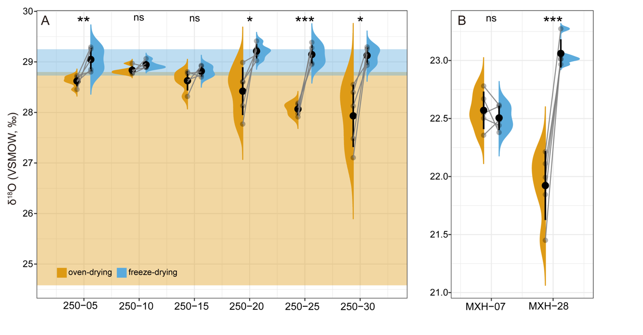 相比之下,冷冻干燥方法的优势非常明显。冻干的低温和真空条件可以使水分直接由固态升华为气态,避免了液态水与纤维素的过度接触,从而减少了角化现象的发生。冷冻干燥能有效保留纤维素的原始结构,使得测得的δ18O值更加稳定。在他们的研究中,冷冻干燥样品的同位素结果与标准纤维素几乎一致,且数据波动远小于烘干样品(图5)。