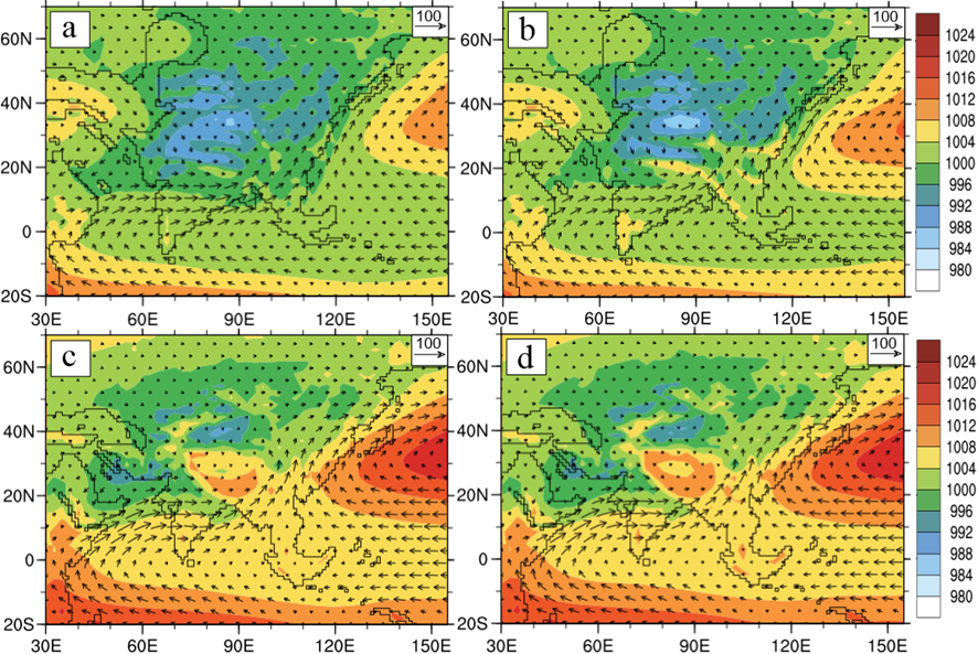 图4 模拟的夏半年(5月至9月)海平面气压(阴影色块:hPa)以及整层水汽通量(矢量箭头:kg m-1s-1),对应的实验分别为:(a) LEOC_LCO2、(b) LEOC、(c) EMIO_LCO2 和 (d) EMIO