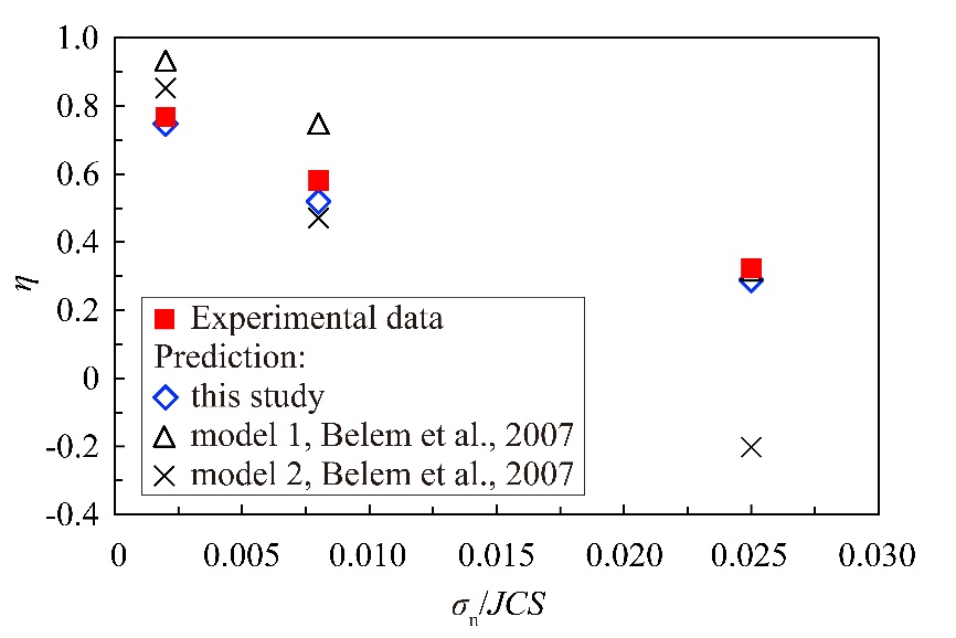 针对这一问题,中国科学院地质与地球物理研究所祁生文研究员团队系统总结了现有结构面形貌退化模型的优缺点,提出了一个考虑剪切速率影响的结构面粗糙度退化模型。该模型综合考虑了法向应力、初始粗糙度、剪切速率及循环位移幅值等多个因素,建立了新的结构面抗剪强度准则(公式2)。与现有模型相比,新模型在预测结构面粗糙度退化方面具有更高的准确性,且参数更少、形式更简洁,便于工程应用(图1)。
