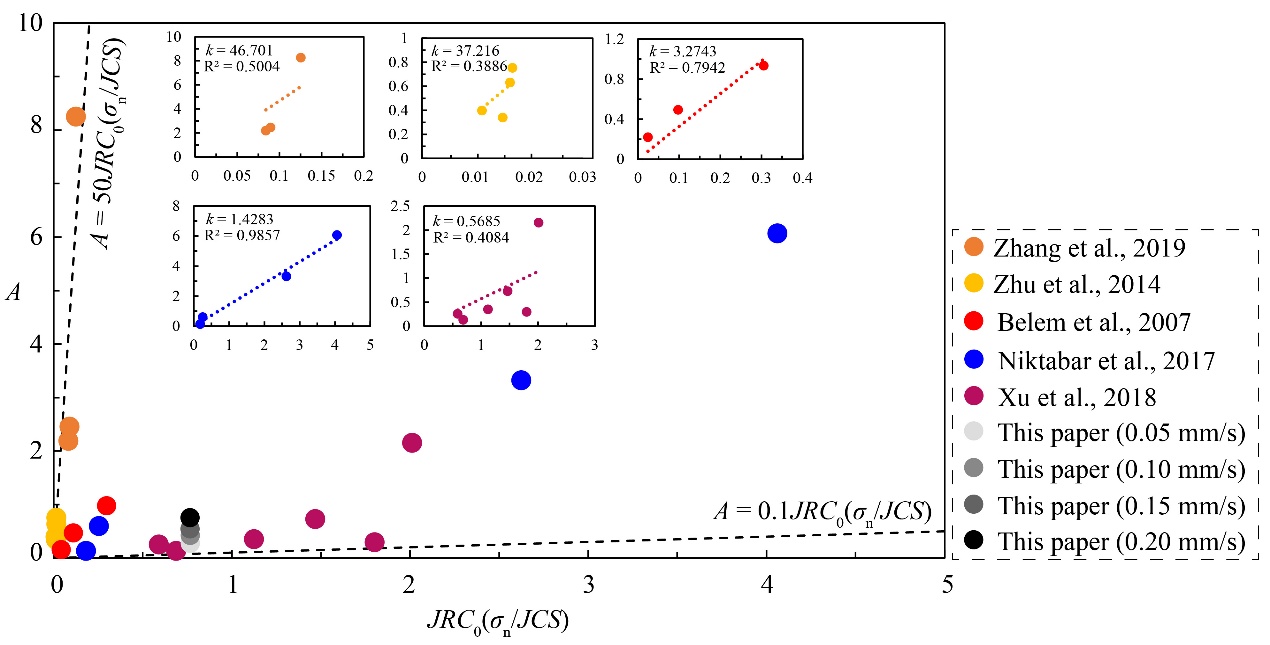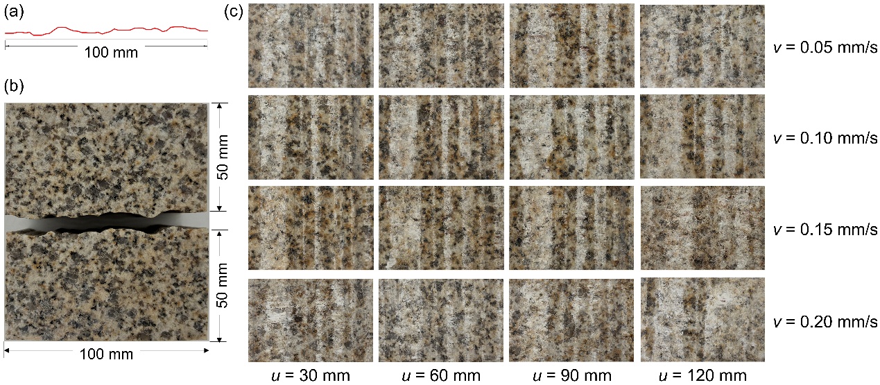 前人的实验研究表明,结构面的粗糙度随着剪切位移的累积发生退化(背后的物理机制为剪切导致磨损和起伏体剪断),从而导致结构面强度的降低。已有研究提出了一些结构面粗糙度退化的刻画模型,并提出法向荷载和初始粗糙度等影响粗糙度退化速率的因素。近年来,加载速率对结构面的剪切特性的影响得到关注,实验结果显示结构面的形貌退化具有速率依赖性。然而,已有的起伏体形貌退化模型并未考虑这一因素,从而无法准确定量刻画结构面粗糙度及强度在地震循环荷载作用下的退化规律。