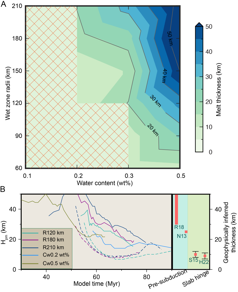 LVZs不仅在岩石圈底部形成,还可能随着俯冲过程被拖曳回地幔转换带甚至更深的地幔区域,另一部分熔融层可能存在于约300 km深度,与板下熔体层近平行地展布。这一过程对于理解地幔的物质循环和地球动力学具有重要意义。研究表明,俯冲板片剪切作用将熔体层拖曳变薄至10–15 km(图3),随后在粘性耦合作用下随板片俯冲再循环至地幔转换带甚至下地幔,完成深部水的内部循环。目前仅有的几个(如中美洲、新西兰、卡斯卡迪亚俯冲带)高分辨率地球物理观测推测的熔体层的厚度约10–25 km,与模型预测的厚度较为一致。这一过程不仅影响了地幔的物质组成,少量熔体(1%–3%)可能显著降低地幔黏度,进而影响板块拖曳力与俯冲动力学。