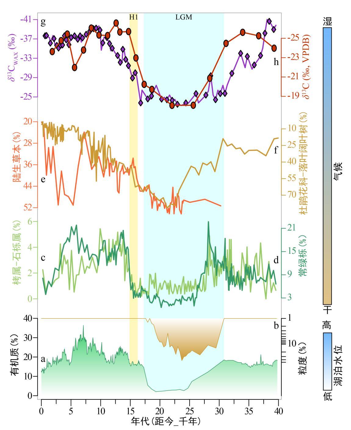 图2 湖光岩玛珥湖 4万年以来湖泊水位记录与区域气候代用指标的对比。a. 湖光岩玛珥湖沉积物中有机质含量;b. 湖光岩玛珥湖沉积物中>2000 mm粗颗粒百分;c. 冲绳海槽热带区域栲属-石栎属花粉百分比 (Xu et al., 2013);d. 冲绳海槽热带区域栎属常绿类花粉百分比 (Xu et al., 2013);e. 湖光岩玛珥湖陆生草本植物花粉百分比 (Meng et al., 2017);f. 中国东南亚热带泥炭沼泽杜鹃花科-落叶阔叶树花粉百分比 (Yue et al., 2012);g. 印度尼西亚Towuti湖岩芯植物表皮蜡脂 δ13C (Russell et al., 2014);h. 菲律宾甘古布洞穴蝙蝠粪沉积物δ13C (Wurster et al., 2010)。浅黄色色带标示Heinrich 1事件,浅蓝色色带标示末次盛冰期时期