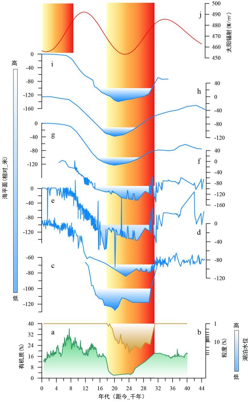 图3 湖光岩玛珥湖 4万年以来湖泊水位记录与反映全球冰量变化的海平面曲线和北半球夏季日照量的曲线对比。a. 湖光岩玛珥湖沉积物中有机质含量;b. 湖光岩玛珥湖沉积物中>2000mm粗颗粒百分;c-i. 全球海平面记录:c. 基于大堡礁珊瑚和藻类化石组合重建的相对海平面变化 (Yokoyama et al., 2018);d. 红海相对海平面变化记录 (Grant et al., 2014);e. 基于珊瑚化石重建的全球海平面变化 (Hibbert et al., 2016);f. 基于全球13个地点珊瑚数据整合的全球海平面变化 (Medina-Elizalde, 2013);g. 基于统计性海平面转换函数重建的全球海平面变化 (Waelbroeck et al., 2002);h. 基于冰川均衡调整(GIA)模型校准的全球海平面变化 (Gowan et al., 2021);i. 基于冰量等效海平面函数重建的全球海平面变化 (Lambeck et al., 2014);j. 北半球夏季日照量 (Berger and Loutre, 1991)