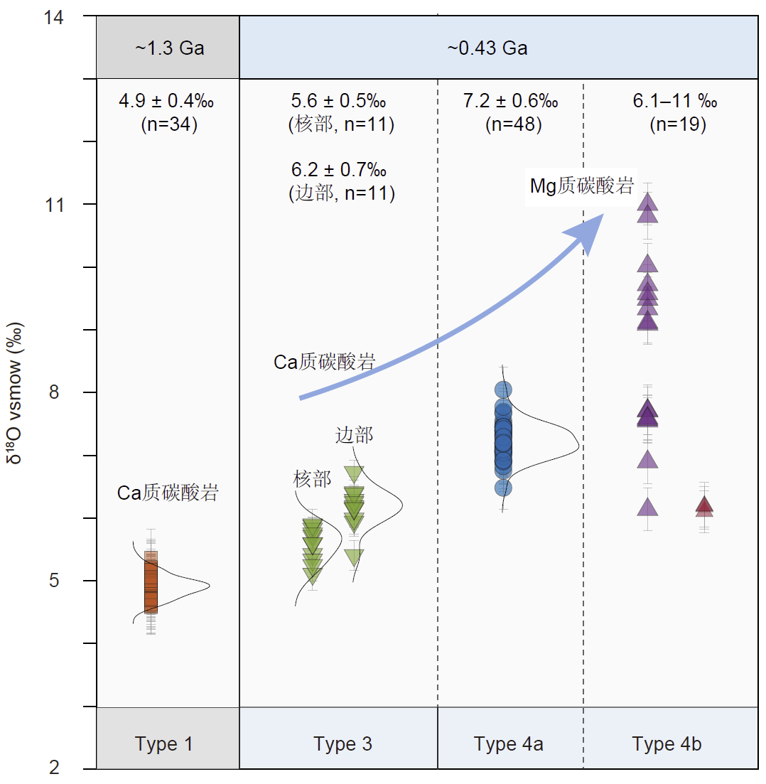 分析结果显示,中元古代碳酸岩锆石具有地幔值范围内的氧同位素组成(δ18O = 4.9±0.4‰,图2)及较低的HfO2含量(HfO2 = 0.02–1.9 wt.%,图3);而早古生代碳酸岩锆石不仅氧同位素值显著升高、变化范围大(δ18O = 5–11‰,图2),并伴随HfO2含量的明显升高(HfO2 = 1.6–4.7 wt.%,图3)。值得注意的是,锆石氧同位素值的升高与其寄主碳酸岩的化学成分演化相耦合,表现为随着锆石δ18O值和HfO2含量升高,寄主碳酸岩岩石组成由Ca质向Mg质过渡(图2)。
