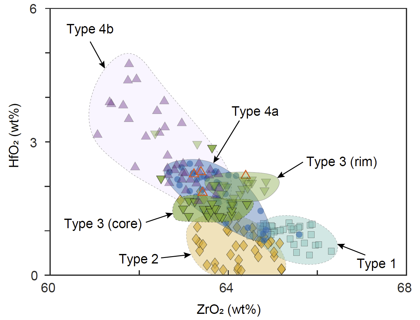 图3 白云鄂博矿床两期碳酸岩锆石的ZrO2-HfO2含量对比。早古生代碳酸岩锆石(Type3和4)HfO2含量高于中元古代碳酸岩锆石(Type1和2)