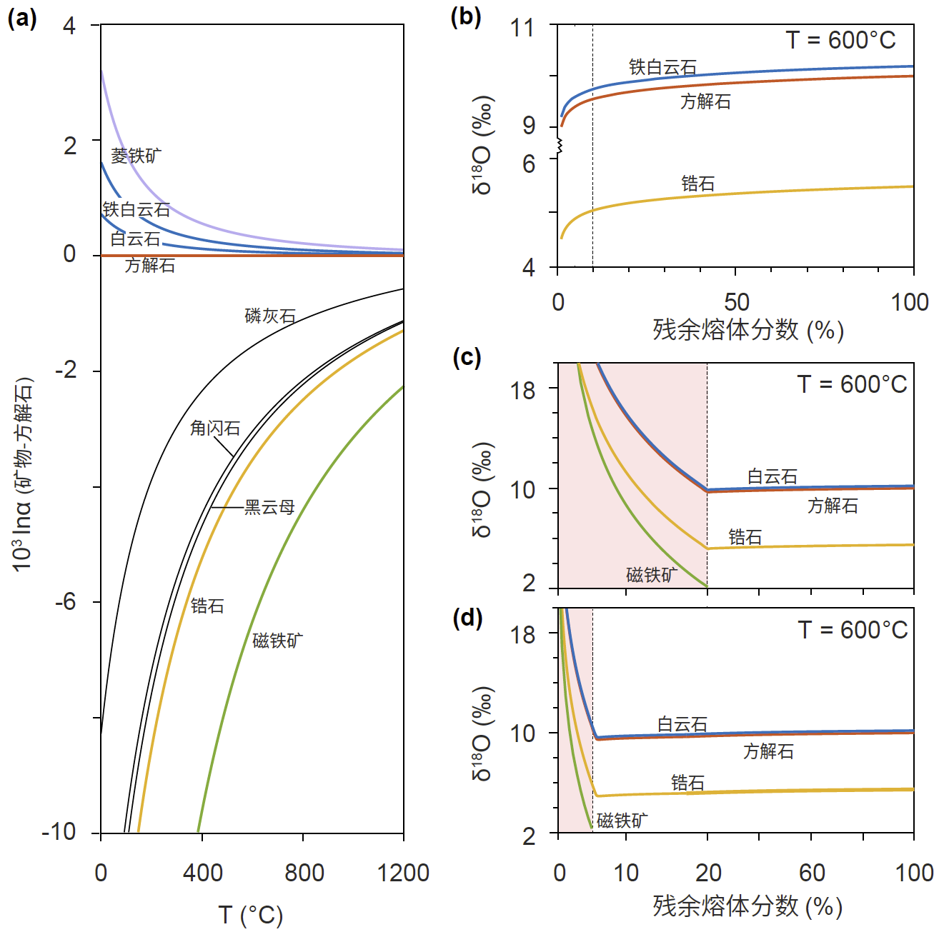 图4 碳酸岩体系氧同位素分馏模拟。(a)常见矿物的氧同位素分馏特征;(b)无磁铁矿分离结晶时碳酸岩体系的氧同位素组成模拟;(c-d)岩浆晚期伴有磁铁矿分离结晶时体系氧同位素组成模拟
