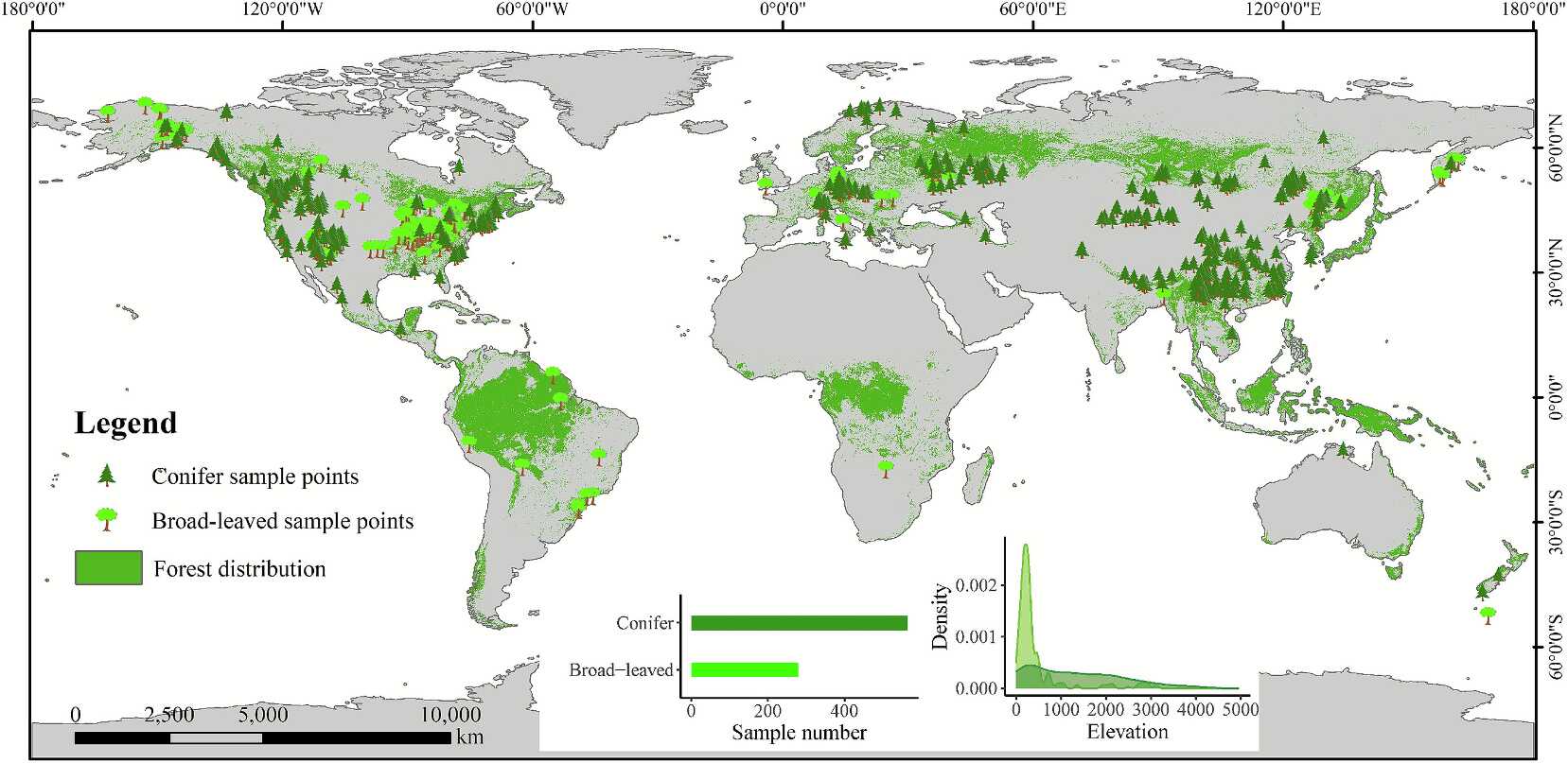 图1 研究区树木年轮网络样点的空间分布。子图从左到右分别是针叶树和阔叶树样点的数量统计及其海拔分布的核密度图