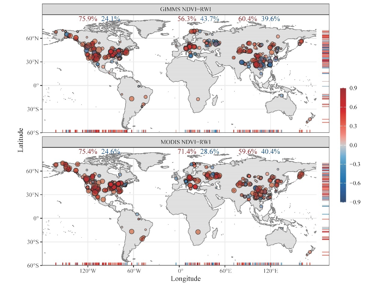 图2 2000-2013年公共时段两种NDVI与树轮指数之间在当年7月份相关系数的空间分布。图中圆圈越大代表相关性越强,右侧和下侧的短线表示点位相关系数在坐标轴上的分布。上侧的数字百分比从左到右分别表示北美洲、欧洲和亚洲区域正负相关所占的比重