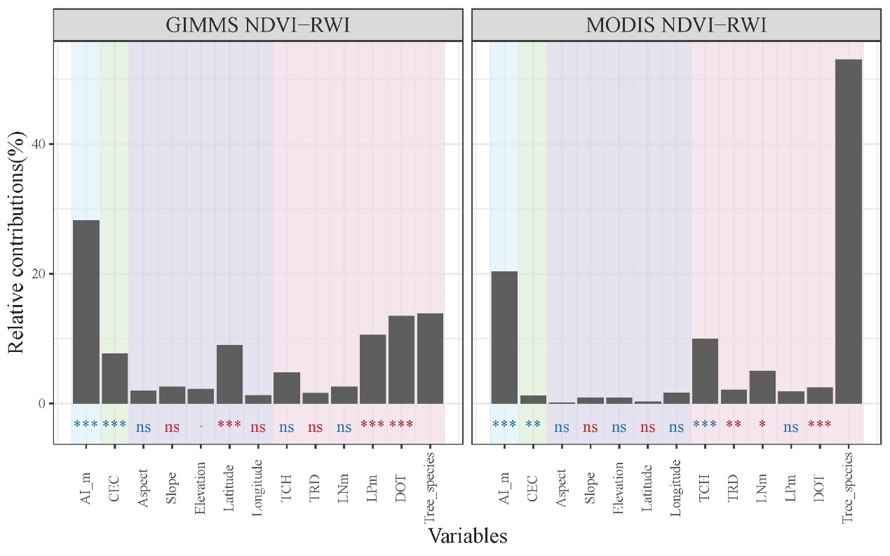 图3 NDVI与RWI关系的影响因素。图中显著性标记的红色和蓝色分别表示正向和负向关系。***,**,*,·,ns分别表示p<0.001,p<0.01,p<0.05,p<0.1,p>0.1