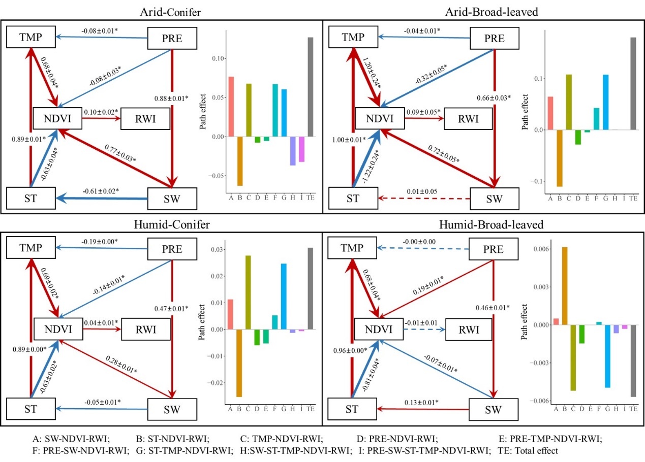 图4 不同干湿条件下针、阔叶树的NDVI、树轮指数和环境因子之间关系的路径图及其路径效应。颜色(消极和积极的影响分别用蓝色和红色箭头表示)和箭头的宽度分别表示路径系数的符号和大小。箭头上的数字表示区域内标准化路径系数的平均值和标准误差。路径效应图中大写英文字母(A-I)表示不同路径的影响,TE表示总效应。TMP:平均温度;PRE:总降水量;ST:平均土壤温度;SW:平均土壤水分;NDVI:归一化植被指数;RWI:树轮指数