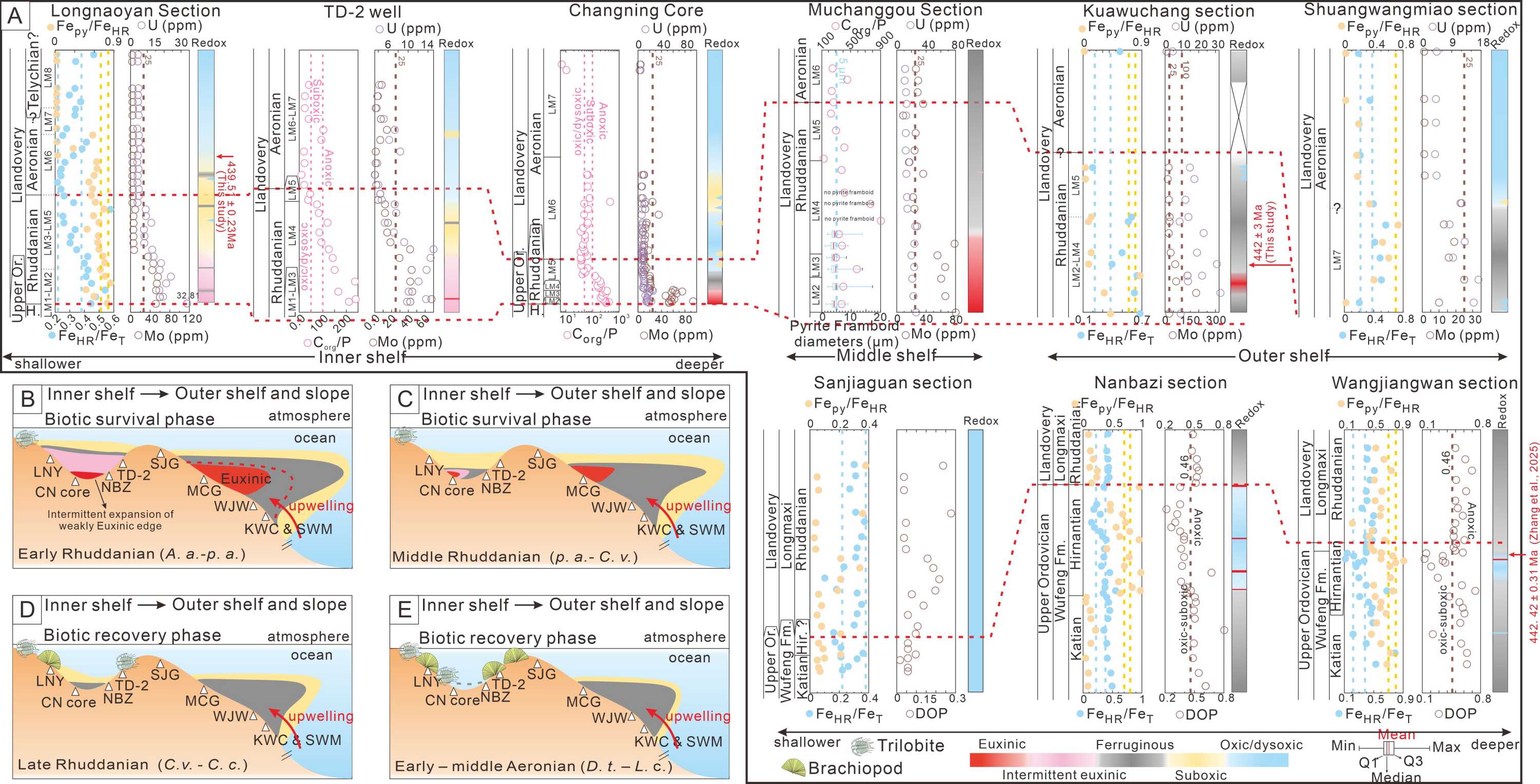 与地质历史中多数大灭绝事件之后生物快速再辐射不同,晚奥陶世大灭绝后的生命复苏异常缓慢且呈现显著的区域差异,然而其控制机制仍缺乏系统认识。有研究显示,广泛的海洋缺氧是晚奥陶世大灭绝之后生命复苏受阻的关键因素之一,但志留纪早期海洋氧化还原环境如何在时间和空间上演化,至今仍不清楚。在中国华南地区,内陆架底栖生态系统的恢复恰好发生在鲁丹期–埃隆期之交的全球降温过程中,但这一气候变化由何驱动,其是否与有机碳埋藏变化及海洋氧化还原结构调整有关,并进一步影响内陆架生态系统的恢复,目前仍不明了。