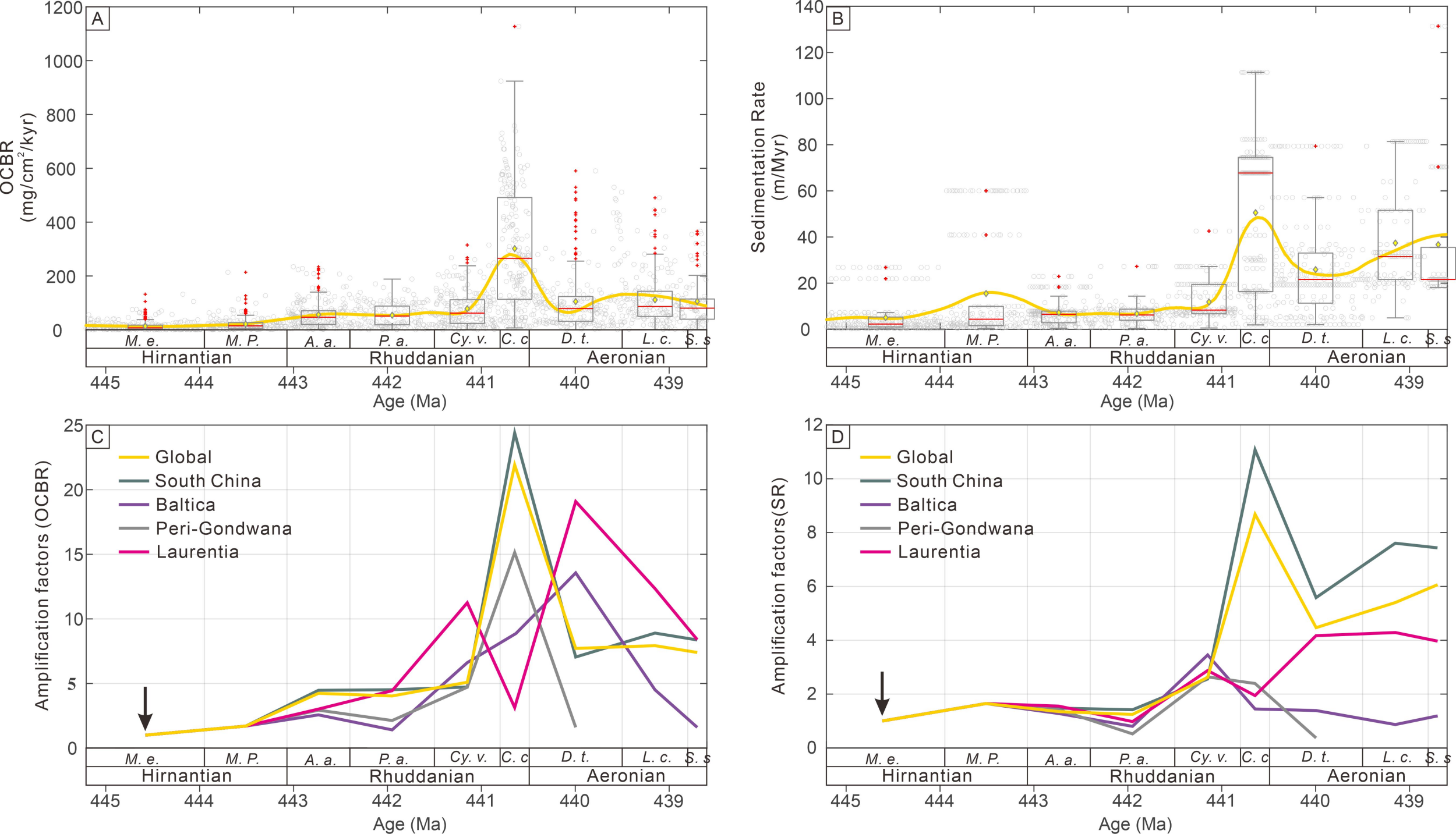 进一步的全球数据整合表明,这一氧化还原环境改善与一次显著增强的有机碳埋藏事件密切相关。在兰多维列世鲁丹期晚期,全球有机碳埋藏速率相对于晚奥陶世赫南特期增长了23倍,大量有机碳被迅速埋藏在大陆架沉积物中(图2),促使大气二氧化碳浓度迅速降低,并引发全球降温。同时,汇编的锶同位素证据也指示大陆硅酸盐风化作用在该时期同步增强,进一步加强了对大气二氧化碳的消耗(图3)。气候变冷不仅提高了海水中氧气的溶解度,也增强海洋通风,从而显著改善了海底的氧气条件。