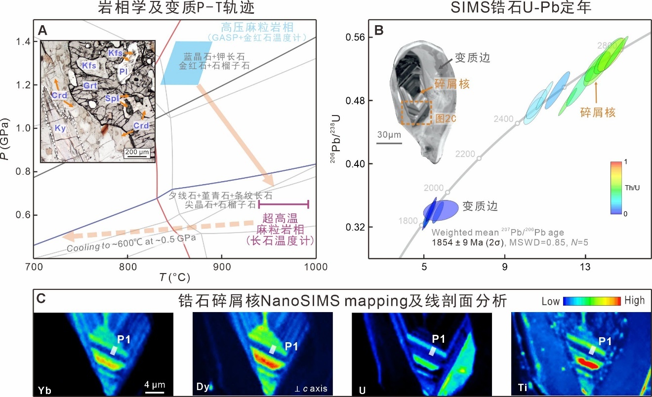 (1)岩石记录早期高压麻粒岩相变质(~1.3 GPa, ~850℃),并经历了减压升温过程,在~0.65 GPa条件下达到≥940℃的超高温峰值(图2A);
