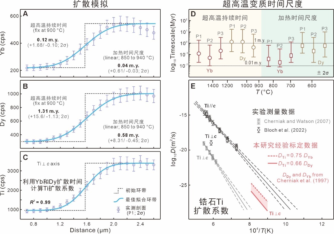 图3 (A–C)在恒温900 ℃和从1.3 GPa,850 ℃线性加热至0.65 GPa,940 ℃开展的锆石Yb、Dy、Ti扩散模拟限定超高温持续时间和加热时间尺度(P1实测剖面);(D)超高温持续时间和加热时间尺度汇总,P1、P2、P3为实测剖面;(E)实验测量的锆石Ti扩散系数和该研究的经验标定