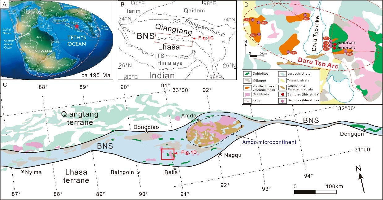 图1 (A)中生代期间的全球板块重建指示特提斯洋属于典型的低纬赤道洋;(B)青藏高原大地构造框架;(C-D)青藏高原中部班公湖-怒江缝合带和达如错弧区域地质图,标注火山岩采样点