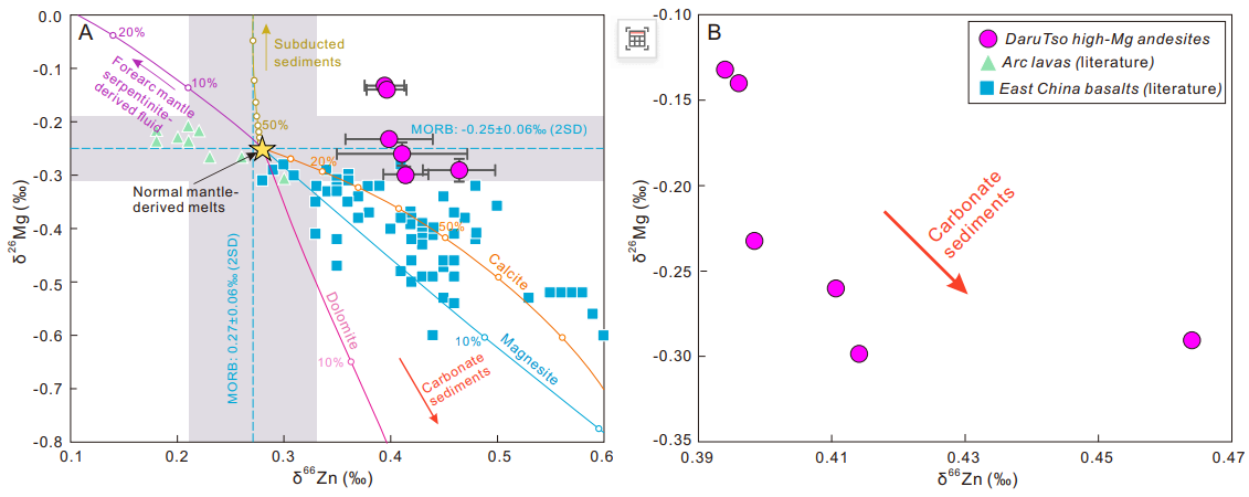 图2 达如错高镁安山岩Mg-Zn同位素耦合指示其地幔源区经历了来自俯冲板片的碳酸盐沉积物的交代作用