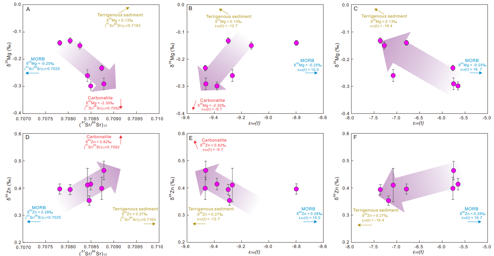 另一项研究聚焦于青藏高原南部拉萨地体新生代(约25-8 Ma)富钾岩浆岩(图5)。这些岩石具有富集的Sr-Nd-Pb-Hf同位素组成,但它们的Mg-Zn同位素特征与俯冲阶段的高镁安山岩明显不同:其δ26Mg值变化较大(-0.46‰至-0.08‰),而δ66Zn值(0.23‰至0.33‰)与洋中脊玄武岩(MORB)相似。