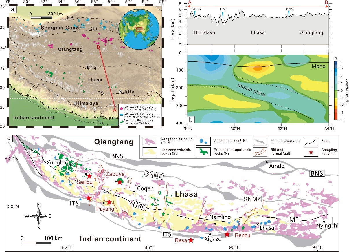 图5 (a)青藏高原新生代富钾岩浆岩的空间分布;(b)横穿青藏高原中南部地球物理剖面;(c)拉萨地块区域地质图(标注富钾岩浆岩采样点)