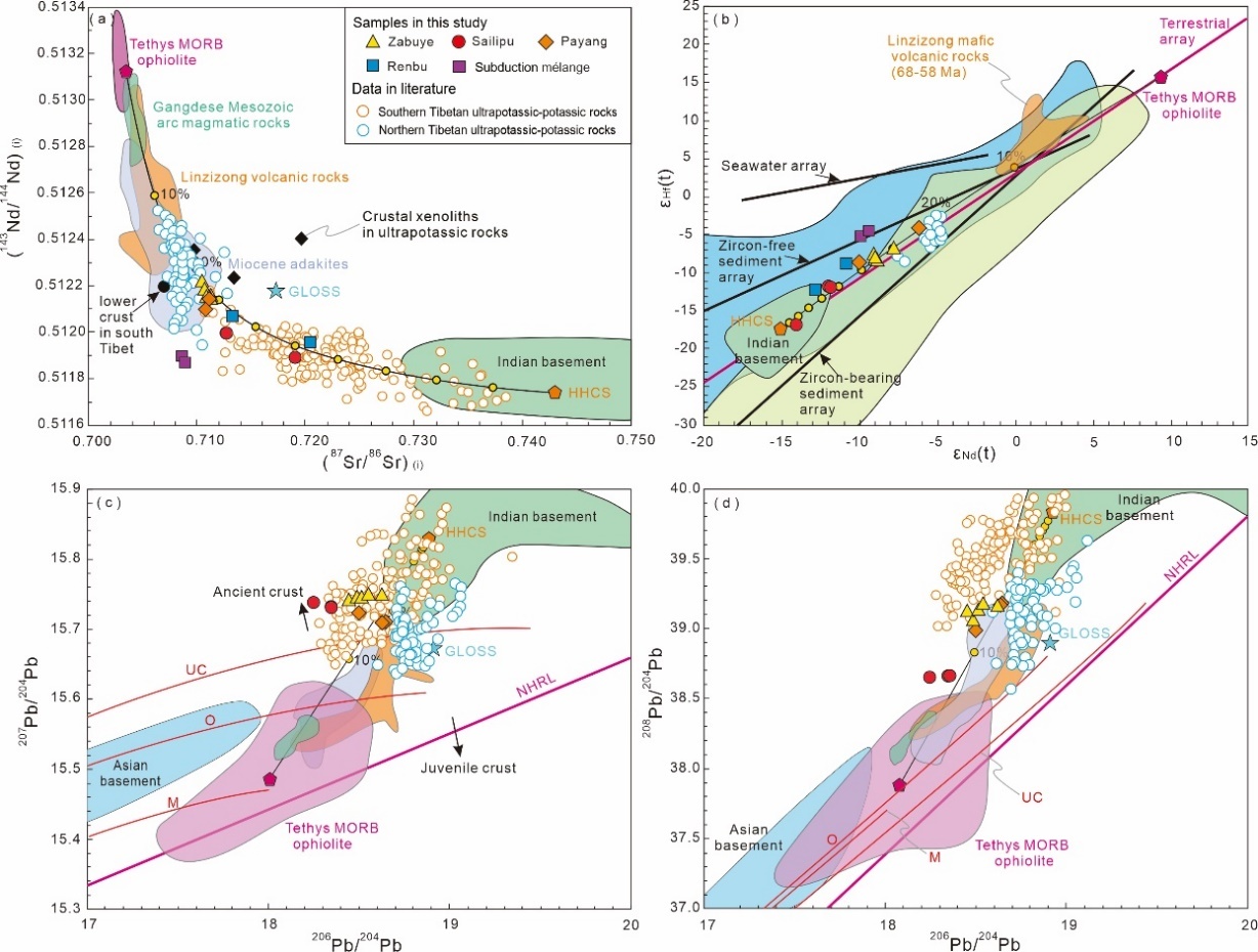 图6 青藏高原新生代富钾岩浆岩的同位素特征表明其起源于含俯冲印度大陆地壳物质的地幔源区