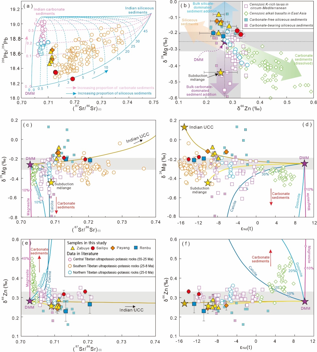 结合富钾岩石全岩地球化学和矿物(橄榄石)化学组成特征,以及全岩Sr-Nd-Pb-Mg-Zn同位素混合模拟,揭示这些富钾岩浆来源于含有俯冲的印度大陆沉积物的混合源区。从时空分布和地球化学趋势上看,源区中再循环沉积物的组成在青藏高原中-北部以碳酸盐为主导,在南部则以硅酸盐为主导(图6,图7)。