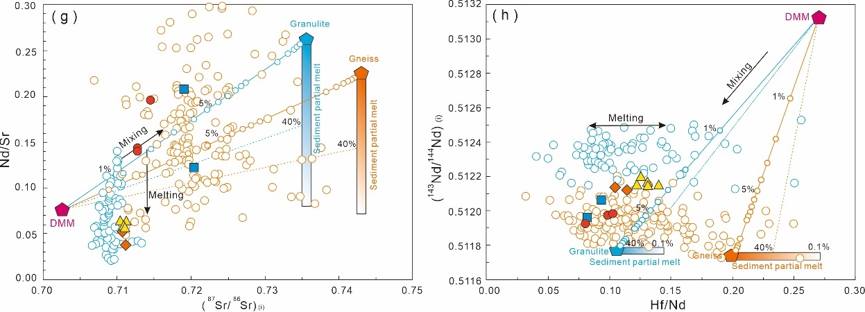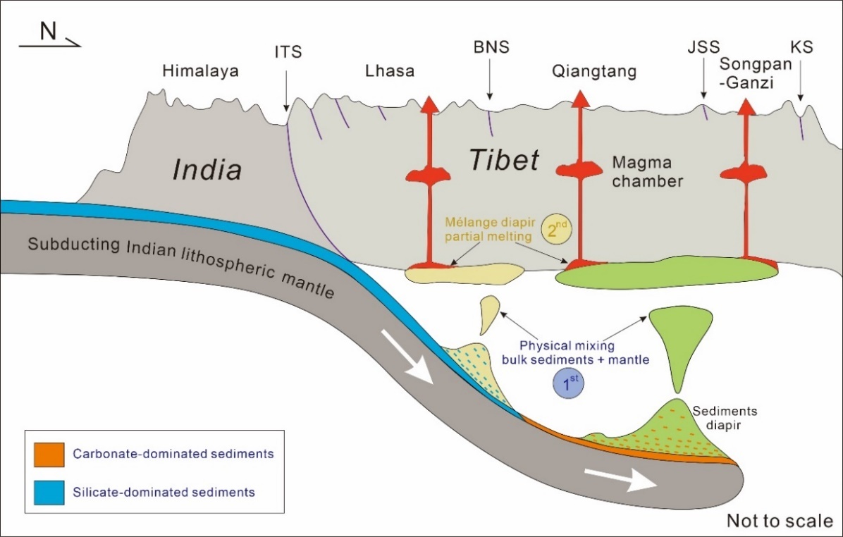 研究表明,简单的地幔交代模型(沉积物熔体/流体加入)难以解释其地球化学特征,而混杂岩底辟熔融模型能更好地吻合观测数据(图8)。该模型认为,在印度大陆岩石圈俯冲过程中,其上部低密度的沉积物(包括丰富的特提斯碳酸盐台地物质)从下插板片上拆离,以底辟体形式上升并与上覆地幔混合形成沉积物主导的混杂岩,部分熔融后产生富钾岩浆。