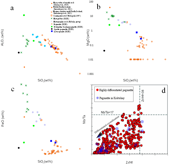 图2 可可托海伟晶岩田岩石样品主量与Nb/Ta, Zr/Hf比特征. (a)、(b)和Al2O3、SiO、总铁与SiO2含量交汇图;(d)Nb/Ta, Zr/Hf与高分异花岗岩A型花岗岩对比图 (底图:吴福元等, 2017)