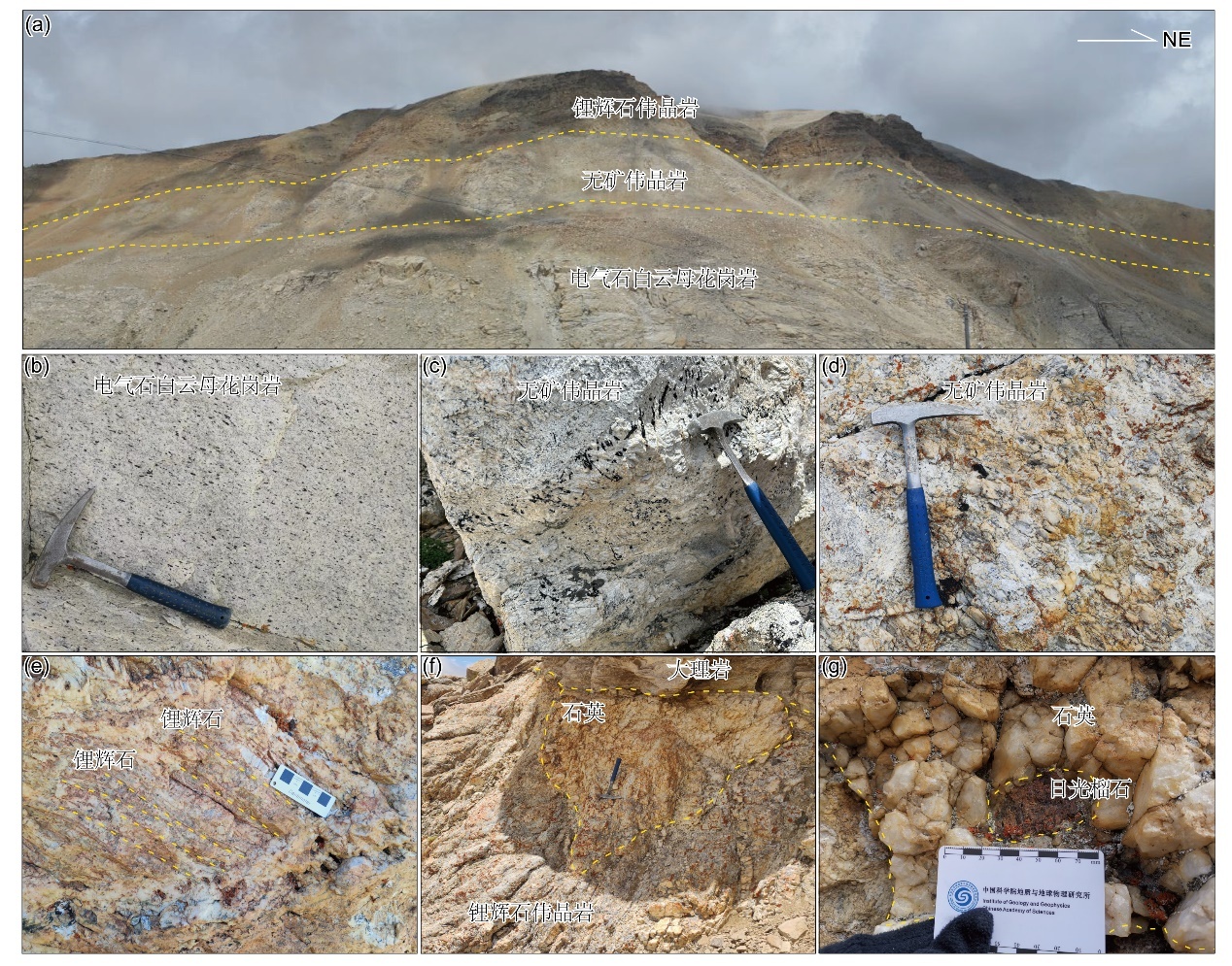 图1 琼嘉岗野外岩相图。(a)琼嘉岗野外岩体分布图;(b)琼嘉岗电气石白云母花岗岩;(c,d)琼嘉岗贫矿伟晶岩;(e,f)琼嘉岗锂辉石伟晶岩;(g)琼嘉岗日光榴石-石英脉