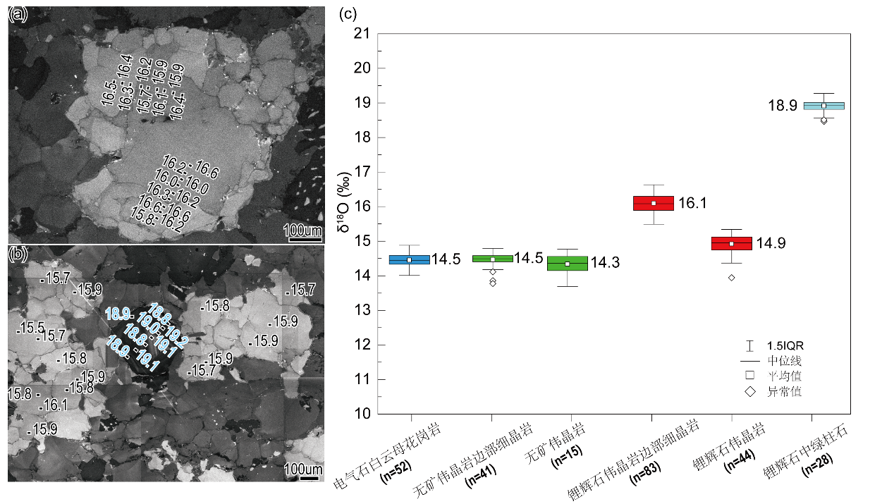 (1)对花岗岩和伟晶岩石英的氧同位素分析显示其变化范围较窄(图2),电气石-白云母花岗岩石英14.0-14.8‰、贫矿伟晶岩及其细晶岩石英13.7-14.8‰、含锂辉石细晶岩石英15.5-16.6‰和核部石英13.9-15.3‰。大部分石英-全岩分馏值(1-2‰)指示处于平衡状态,能够代表岩浆组成。不同岩性石英表现出一致的氧同位素范围,表明它们具有共同的来源;而异常高的δ18O值则表明琼嘉岗锂辉石伟晶岩的源区可能源自高喜马拉雅变沉积岩的部分熔融作用。