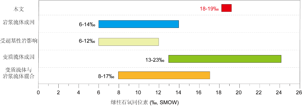 (2)绿柱石的氧同位素分析结果产生了异常高的氧同位素值(18.5-19.3‰)。基于绿柱石-石英之间的同位素平衡分馏公式,石英和绿柱石之间存在明显的同位素不平衡现象。在排除来自源区物质的贡献、大气降水沿藏南拆离系进入体系的影响、大理岩围岩混入的可能性,基于综合收集不同成因绿柱石的氧同位素组成(图3),研究团队倾向认为绿柱石结晶时外部富δ18O变质流体的加入是造成高δ18O绿柱石的氧同位素组成的原因。