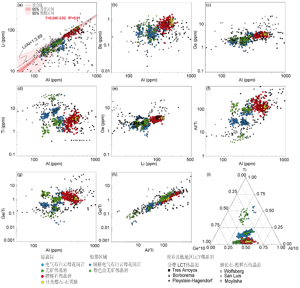 (3)与世界上其他LCT型伟晶岩相比(图4),琼嘉岗电气石白云母花岗岩及锂辉石伟晶岩中石英具有显著强Li-Al相关关系及高Ge/Ti-Al/Ti比值(图4a,h),表明琼嘉岗锂辉石伟晶岩是由高度演化、更富锂的熔体形成。已有的研究表明,在富锂伟晶岩系统中含锂矿物结晶时石英的Li、Al含量最高,演化至热液阶段石英Li和Al含量显著降低;但琼嘉岗地区热液石英(石英+日光榴石脉)同样具有较高Li、Al含量(图4a,黄色圆圈),表明琼嘉岗锂辉石伟晶岩很可能在结晶的初始阶段达到水饱和,流体出溶发生在其伟晶岩系统演化早期。