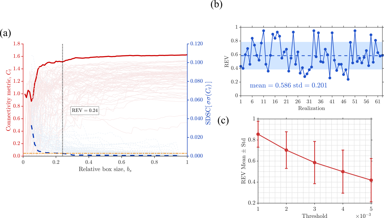 研究团队利用此前提出的一种新型连通性度量指标Ct (Zhu et al.,2024),综合考虑了集群内部连通性和集群间相互作用,能够更准确地描述多集群裂缝网络的连通特征。同时,团队提出了标准差稳定性准则(Standard Deviation Stability Criterion, SDSC),利用二阶统计量实现了REV的客观确定,有效克服了传统方法的主观性问题。通过分析63个天然露头和多种生成DFN场景,研究系统揭示了裂缝网络连通性的尺度依赖规律(图1)。