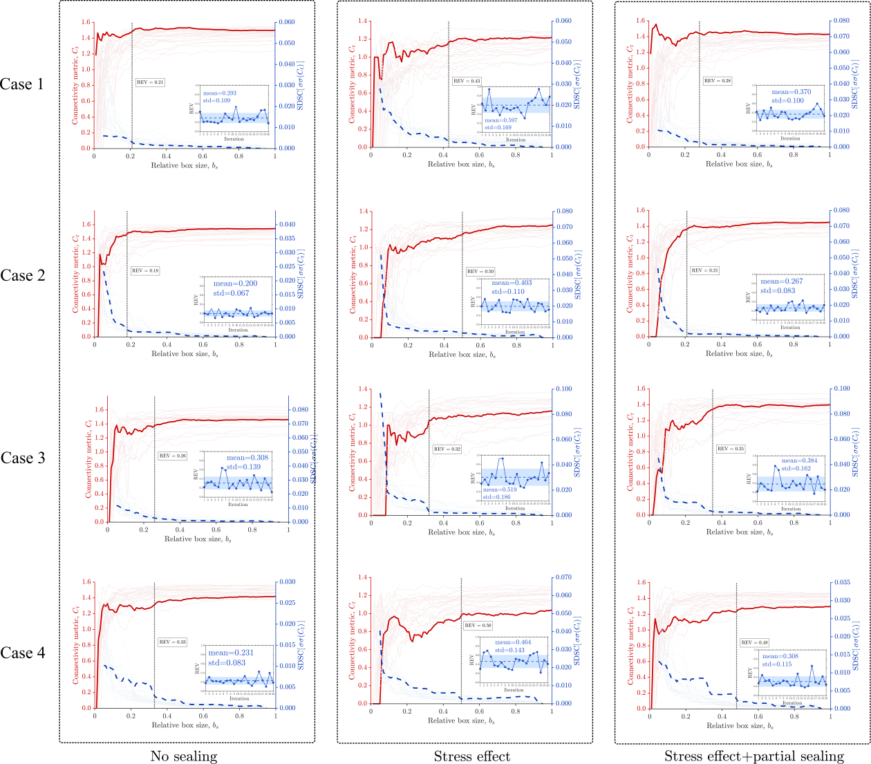 研究发现,裂缝网络连通性表现出明显的尺度依赖性特征,但REV值接近研究系统尺度的同一数量级,其中天然露头的平均REV值为0.586,统计生成的离散裂缝网络超过0.20。这一发现表明,通过常规采样方法获得代表性体积存在根本性限制。裂缝几何特征对REV具有显著影响,其中裂缝的优势方向会显著增加REV尺寸,在应力影响下表现更为显著。当考虑裂缝完全封闭或充填时,仅在原位地应力条件下处于临界应力状态的裂缝保持渗透性,此时由于方向选择性效应,REV的确定最具挑战性,其值相比完全开启状态几乎翻倍,且裂缝集群效应进一步放大了这一影响。相比之下,当裂缝仅部分封闭或充填时,由于一定程度上保持了裂缝方向的多样性,相应的REV值介于完全开启状态与完全封闭(考虑应力作用)状态之间,呈现出中间行为特征(图2,图3)。