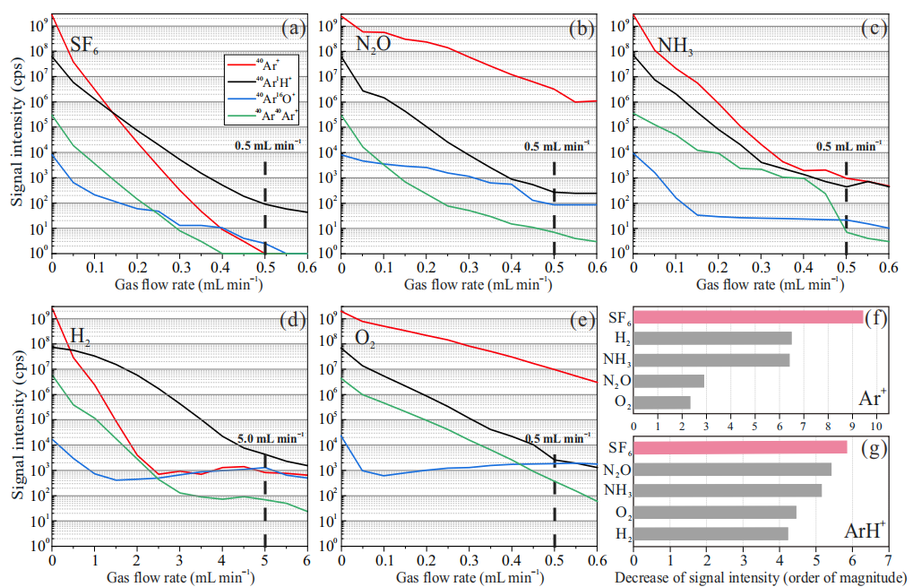 图1 40Ar+、40Ar1H+、40Ar16O+、40Ar40Ar+的信号强度随SF6、N2O、NH3、H2和O2气体流量的变化情况(a-e);(f-g)Ar+和ArH+信号降低幅度
