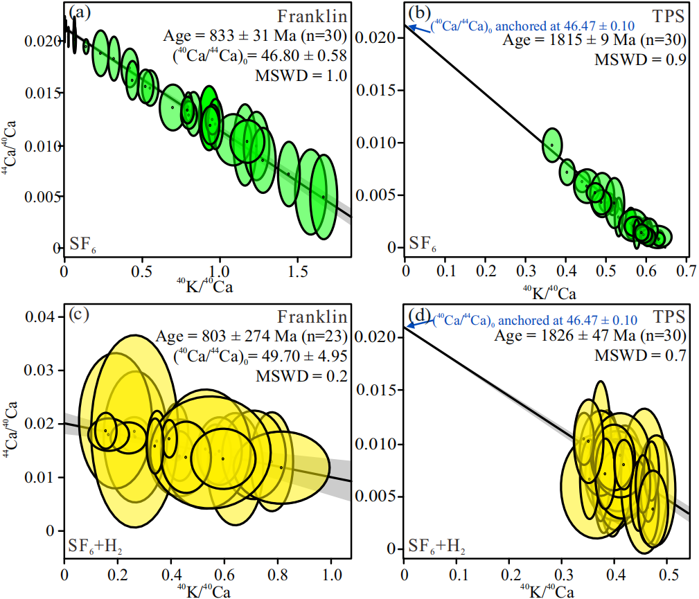 图2 以SF6、SF6+H2为反应气时,Franklin和TPS样品的K-Ca定年结果对比;(a、b)以SF6为反应气时Franklin和TPS的定年结果;(c、d)以SF6+H2为反应气时Franklin和TPS的定年结果