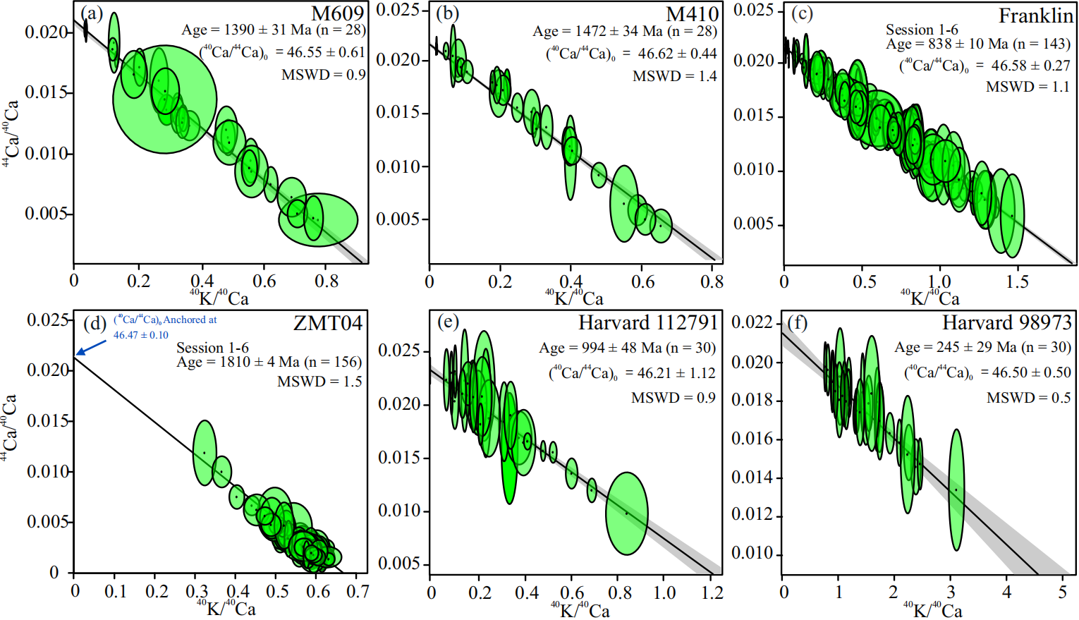 图3 M609、M410、Franklin钾长石的原位K-Ca定年结果(a-c),以及TPS、Mus791、Mus973白云母的原位K-Ca定年结果(d-f)