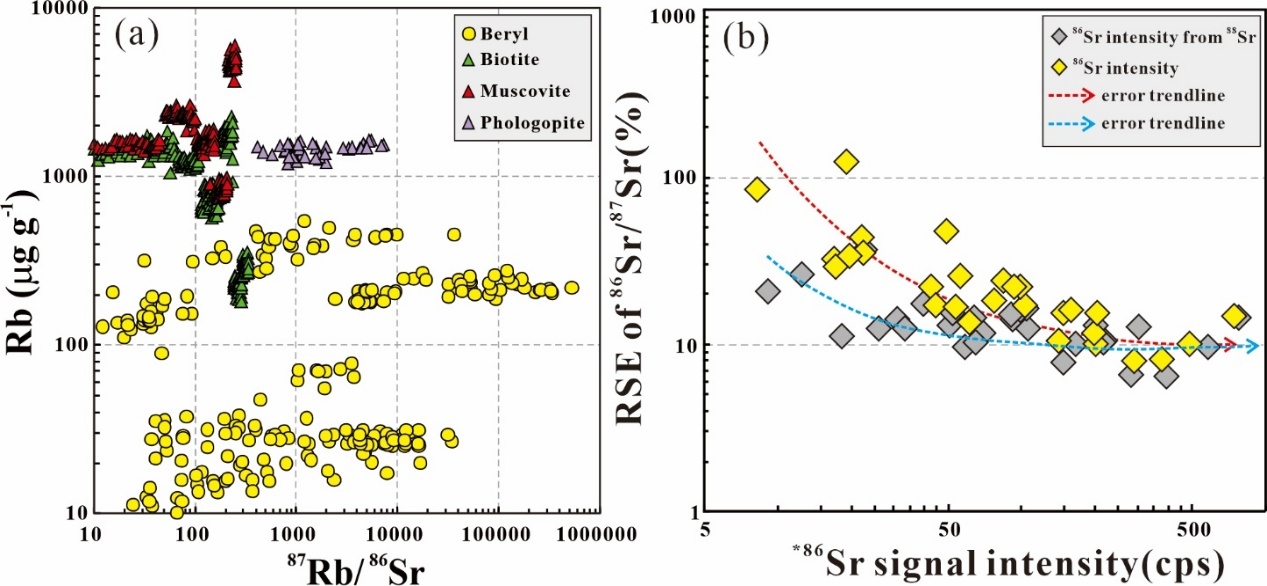 已有研究表明约90%的绿柱石含有5–50 ppm的Rb,且Sr含量极低,从而产生了极高的⁸⁷Rb/⁸⁶Sr比值(往往>10000)(图1)。在这种条件下,单颗粒、单样品(模式)年龄测定成为可能——即在假设初始(普通)锶含量可忽略不计的前提下,直接通过测定的⁸⁷Sr/⁸⁶Sr和⁸⁷Rb/⁸⁶Rb比值计算年龄。这些工作表明,绿柱石的Rb-Sr年代学潜力巨大,但目前缺乏系统性的可靠研究。