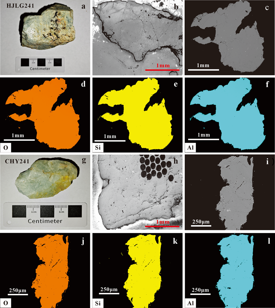 图2 HJLG241和CHY241绿柱石样品手标本及镜下照片和BSE及EDS-mapping图