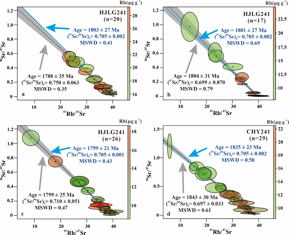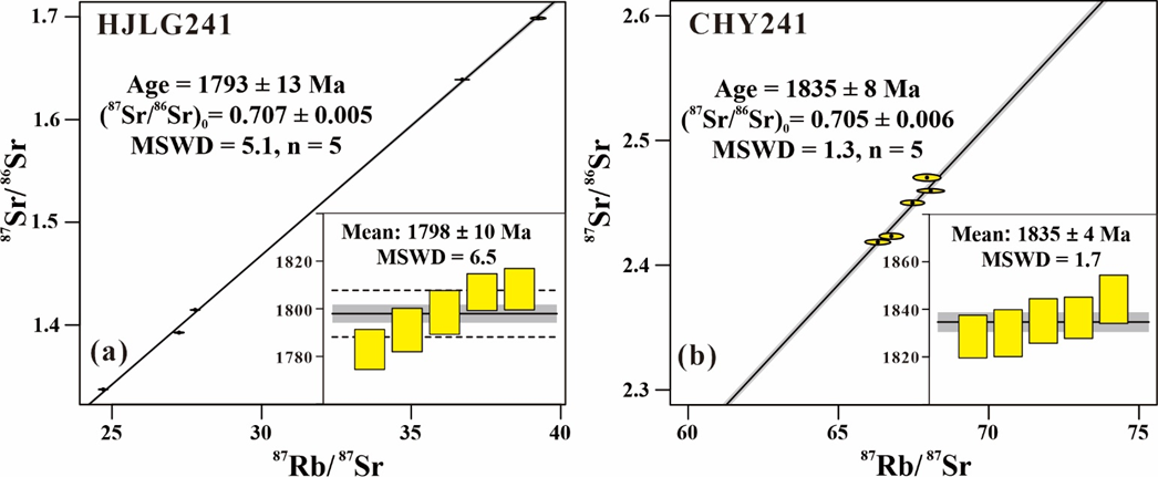 图3 HJLG241和CHY241的激光微区原位Rb-Sr反等时线年龄