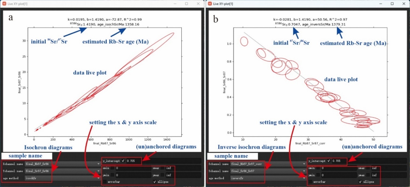 图6 研究团队提出的 Iolite软件中可视化插件“Visual Rb-Sr age”的主要功能,包括实际分析过程中绿柱石的Rb-Sr正等时线图(a)和Rb-Sr反等时线图(b)
