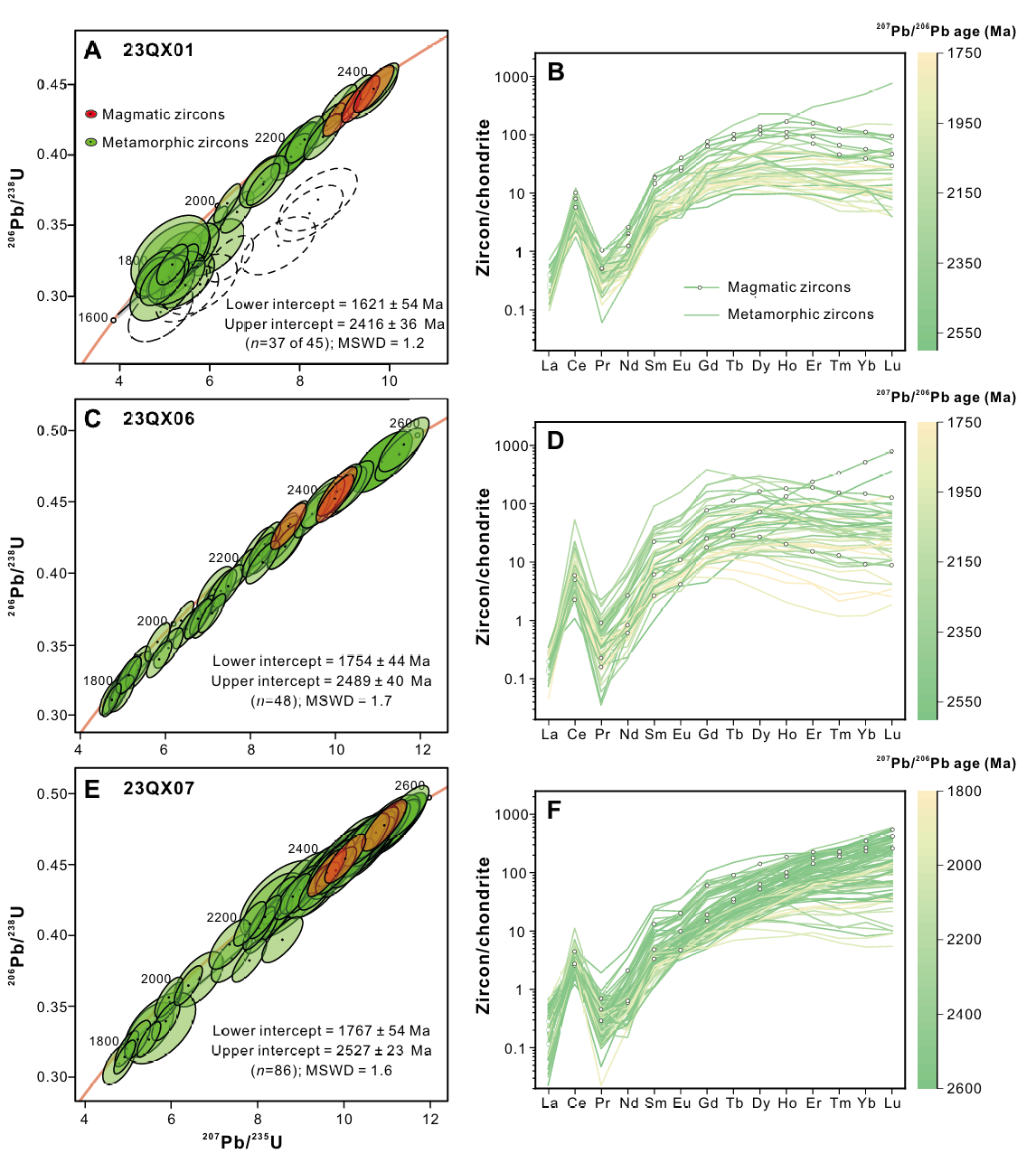 锆石年代学结果显示,三件成分不同的样品(富长石石榴麻粒岩、石榴麻粒岩和石榴辉石岩)均产生了上交点约2.5-2.4 Ga、下交点~1.75 Ga 的不一致线。但不同年龄段锆石普遍显示出较平坦的重稀土元素配分模式,因此只依靠锆石年龄及其稀土元素特征,难以区分不同期次的变质事件,锆石记录的2.47 Ga年龄是否能够代表榴辉岩相变质时代无法得到严格的约束(图2)。