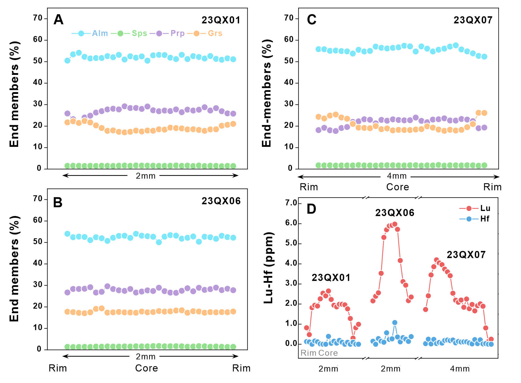 图3 23QX01, 23QX06和23QX07样品石榴子石颗粒的主量元素(A-C)和Lu-Hf元素(D)成分剖面特征