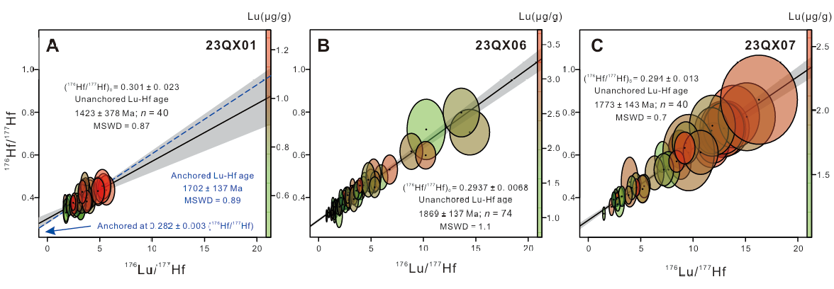 图4 23QX01 (A),23QX06 (B)和23QX07 (C)样品原位石榴子石LA-ICP-MS/MS Lu-Hf等时线图