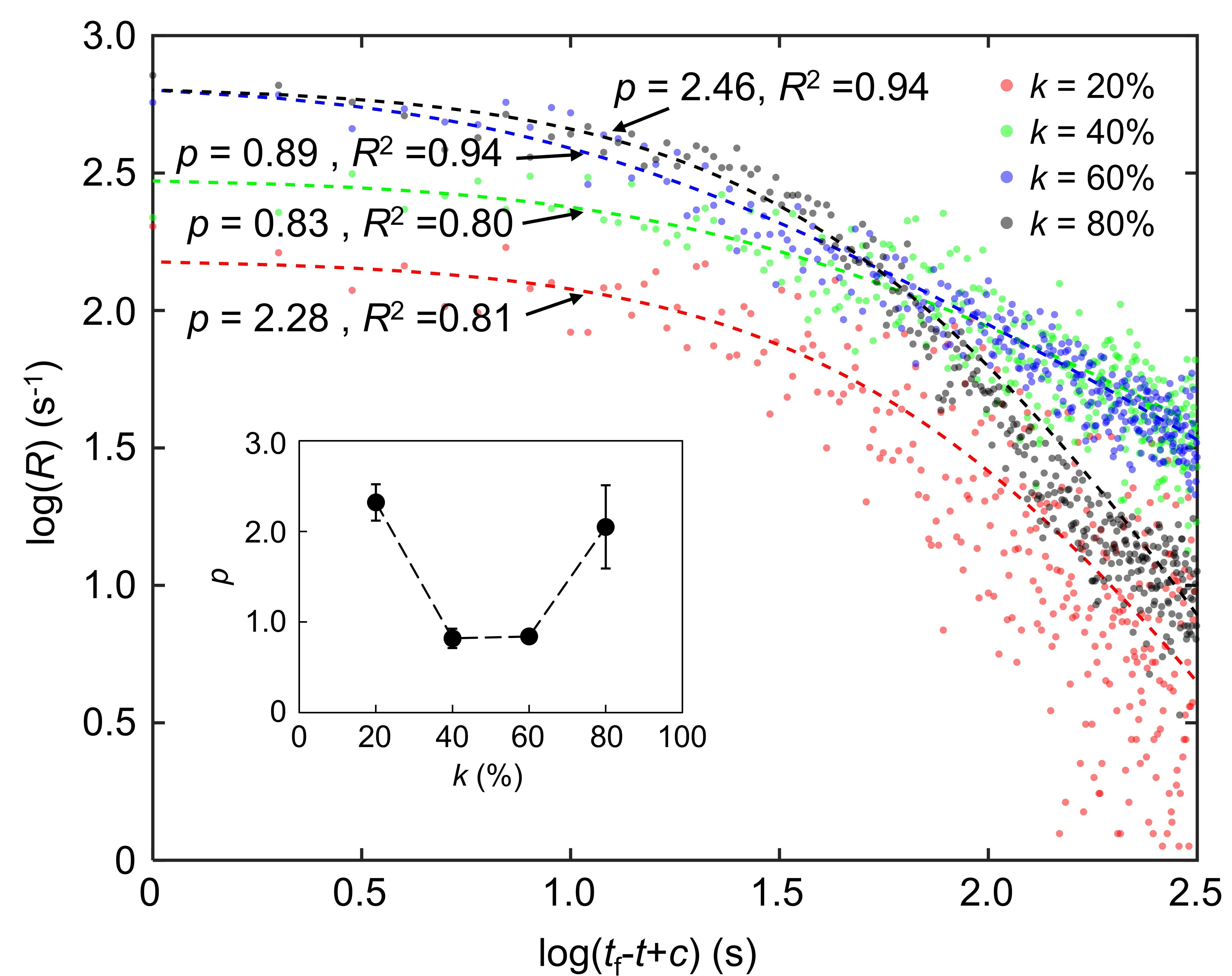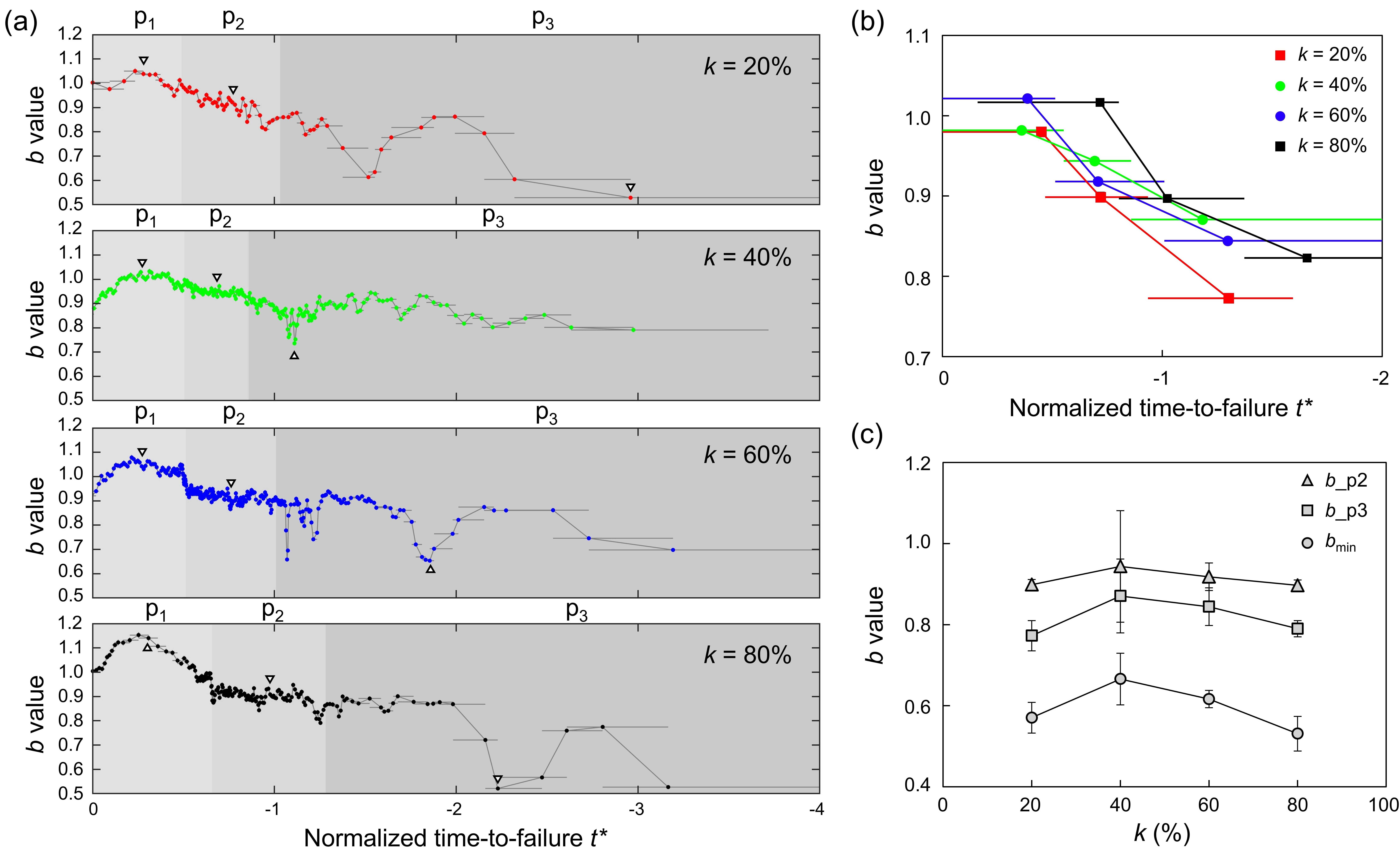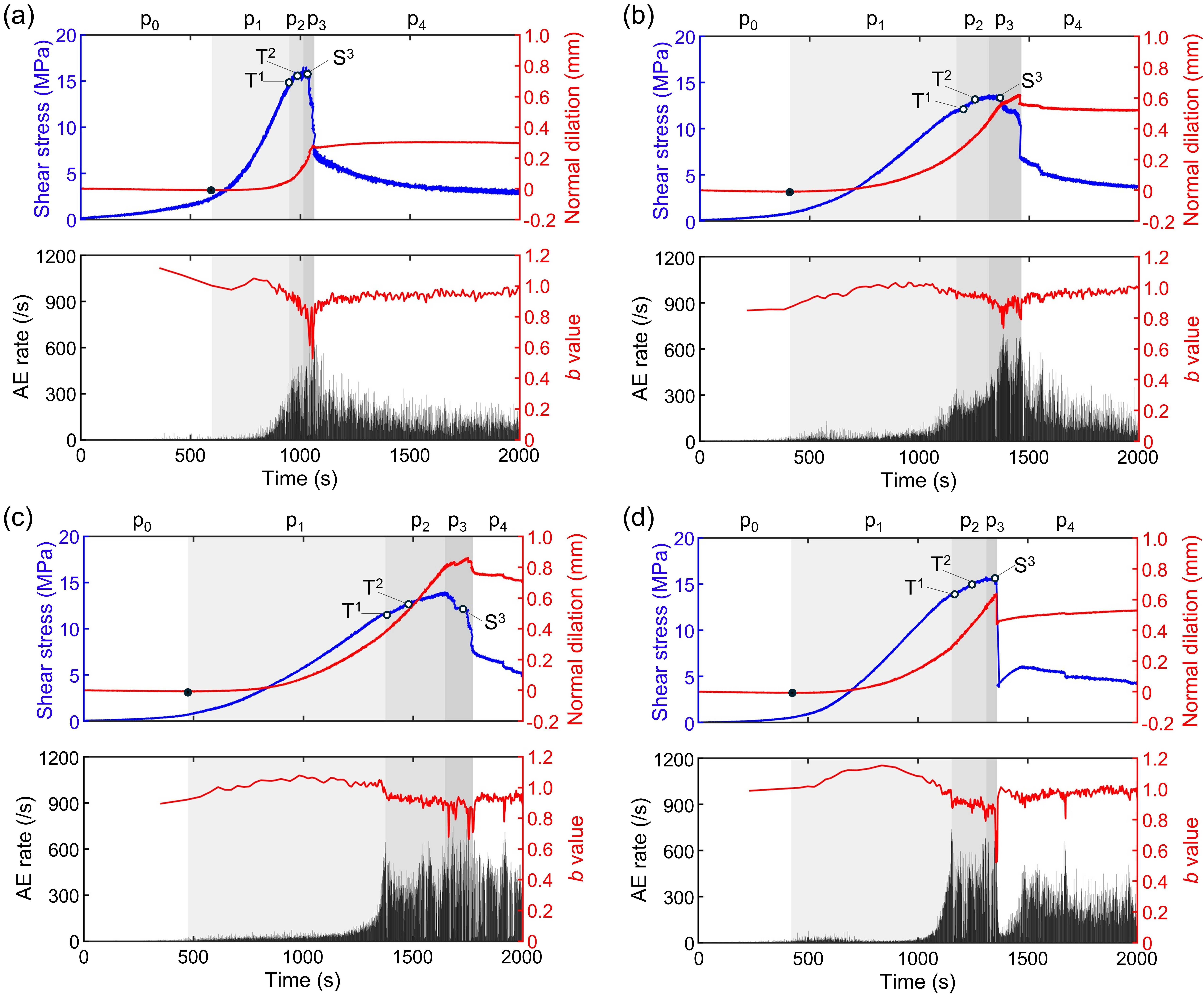 根据剪切力学曲线特征和声发射活动演化规律,厘定了花岗岩岩桥剪切渐进破坏过程法向压密、弥散破坏(稳定破裂)、剪切局部化(不稳定破裂)、最终破坏和残余摩擦等五个阶段,并提出了定量的划分依据(图3)。与完整岩石或完全贯通结构面相比,非贯通结构面剪切的声发射活动呈现了2种不同的前兆异常特征:(1)声发射b值(大小-频度关系指标)在不稳定破裂阶段和最终失稳阶段呈现波动下降而非持续单调下降的特征(图4);(2)在剪切局部化而非最终破坏之前,声发射事件率呈现幂律型增加的特征,符合反向余震分布定律(time-reversed Omori law),其增加的快慢程度可以用该定律关系中的p值刻画(图5)。