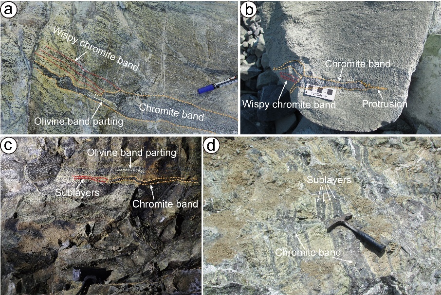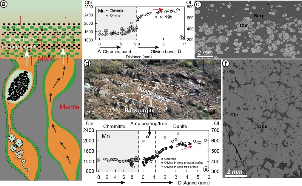 中国科学院地质与地球物理研究所苏本勋研究员以土耳其Bursa蛇绿岩中的似层状铬铁矿床(图1)为研究对象,开展了系统的野外地质调查、岩相学观察和矿物原位元素分析,并对比分析了全球典型蛇绿岩(如阿曼、土耳其Pozantı-Karsantı和Lycian蛇绿岩)中两类铬铁矿床的数据。研究团队通过对Bursa蛇绿岩壳幔过渡带中韵律式交替的铬铁矿条带与橄榄石条带进行精细剖面分析,结合Lycian蛇绿岩中含角闪石的铬铁矿-纯橄岩剖面研究,揭示了铬铁矿与橄榄石在接触边界处的成分突变规律,为流体-橄榄石相互作用提供了关键矿物学证据。