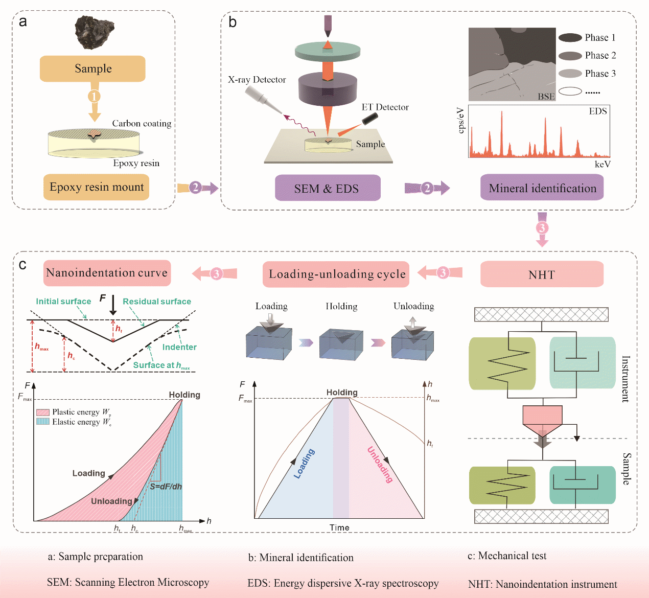 图1 月壤微观力学测量的技术路线图:(a)样品制备;(b)SEM&EDS识别矿物类型;(c)纳米压痕仪测量矿物力学性质